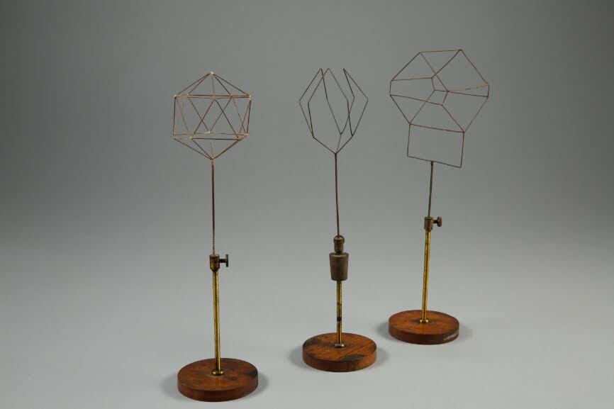 Photograph of wire models Gent University Museum (GUM - Gents Universiteitsmuseum & Plantentuin) (Curatorial description) When you immerse these figures in soapy water, soap films form between the threads. Physics professor Joseph Plateau used them for his research on surface tension. But soap bubbles don't last long. This makes scientific observation difficult. That's why Plateau enlisted the help of photographer Adolphe Neyt. Photography was a relatively new technique at the time, and Neyt was the expert. Thanks to Neyt, Joseph Plateau succeeded in capturing the fragile soap bubbles in three-dimensional stereo photographs. This allowed him to observe them unhindered and share his observations with fellow scientists. The moral of the story? When scientists break away from their disciplines and put their heads together, new insights emerge.
