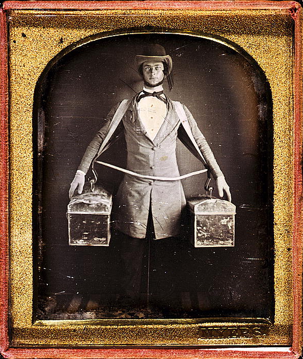 Occupational portrait of a peddler, full-length, standing, facing front, with two bags held at his sides by a harness, neck brace visible between legs
