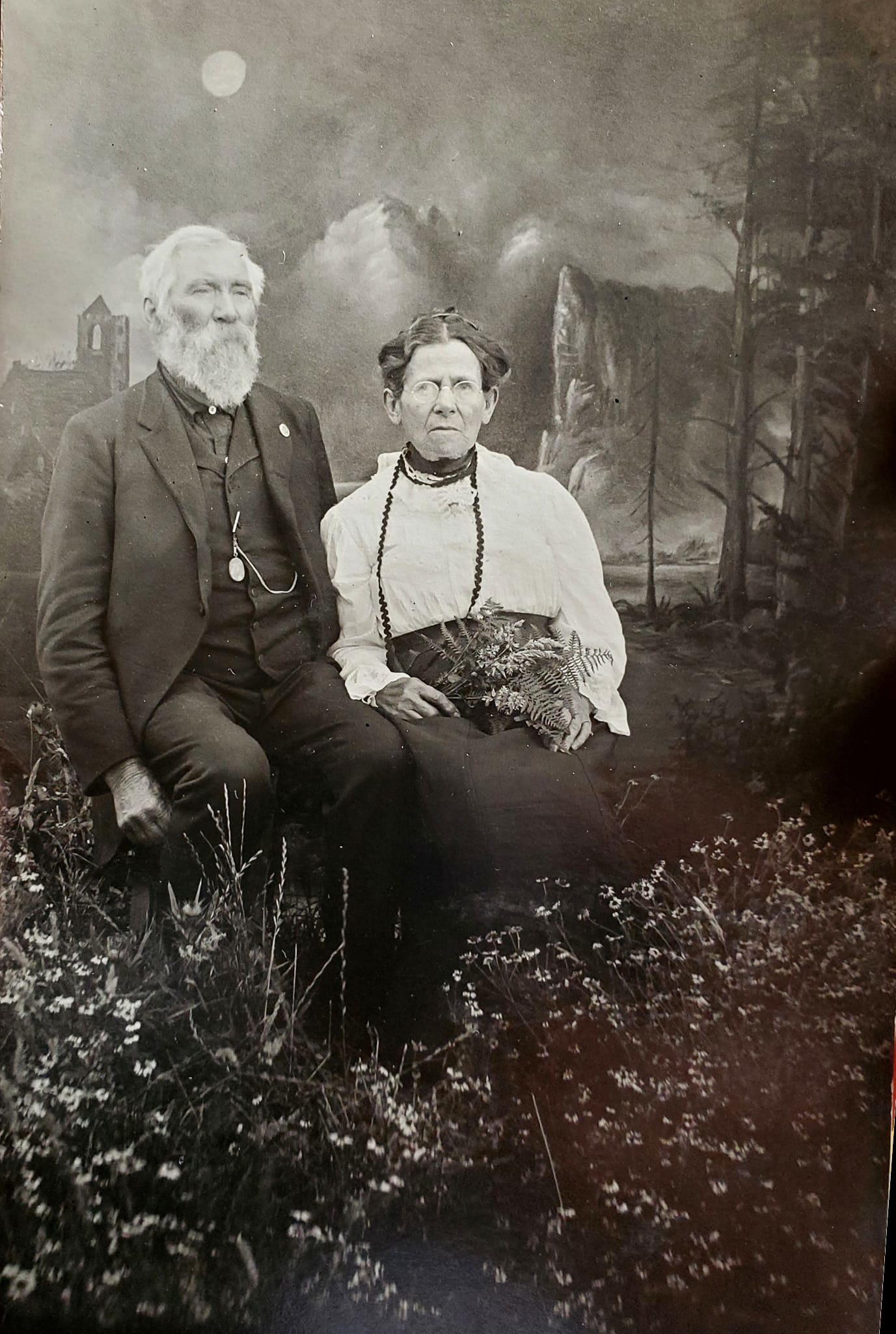 An eldery couple behind a floral foreground and in front of a dramatic landscape background