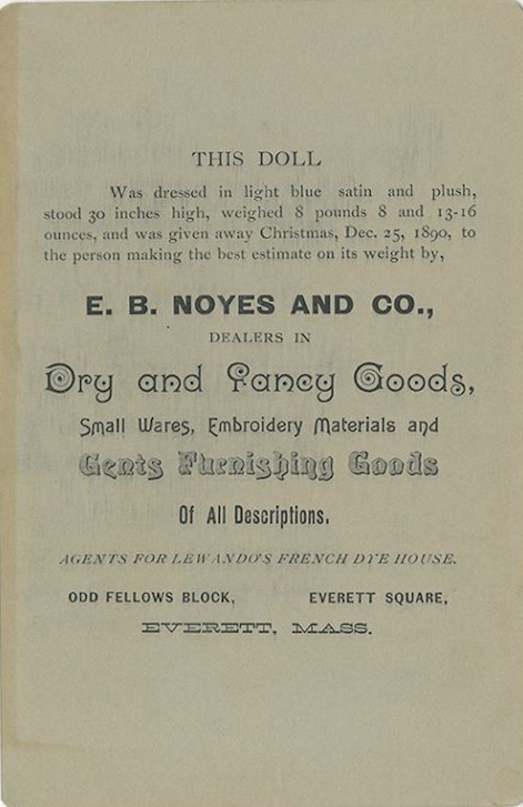 Unidentified photographer 1890 (or later) "This Doll was dressed in light blue satin and plush, stood 30 inches high, weighed 8 pounds 8 and 13-16 ounces, and was given away Christmas, Dec., 25, 1890, to the person making the best estimate on its weight by, E.B. Noyes and Co."