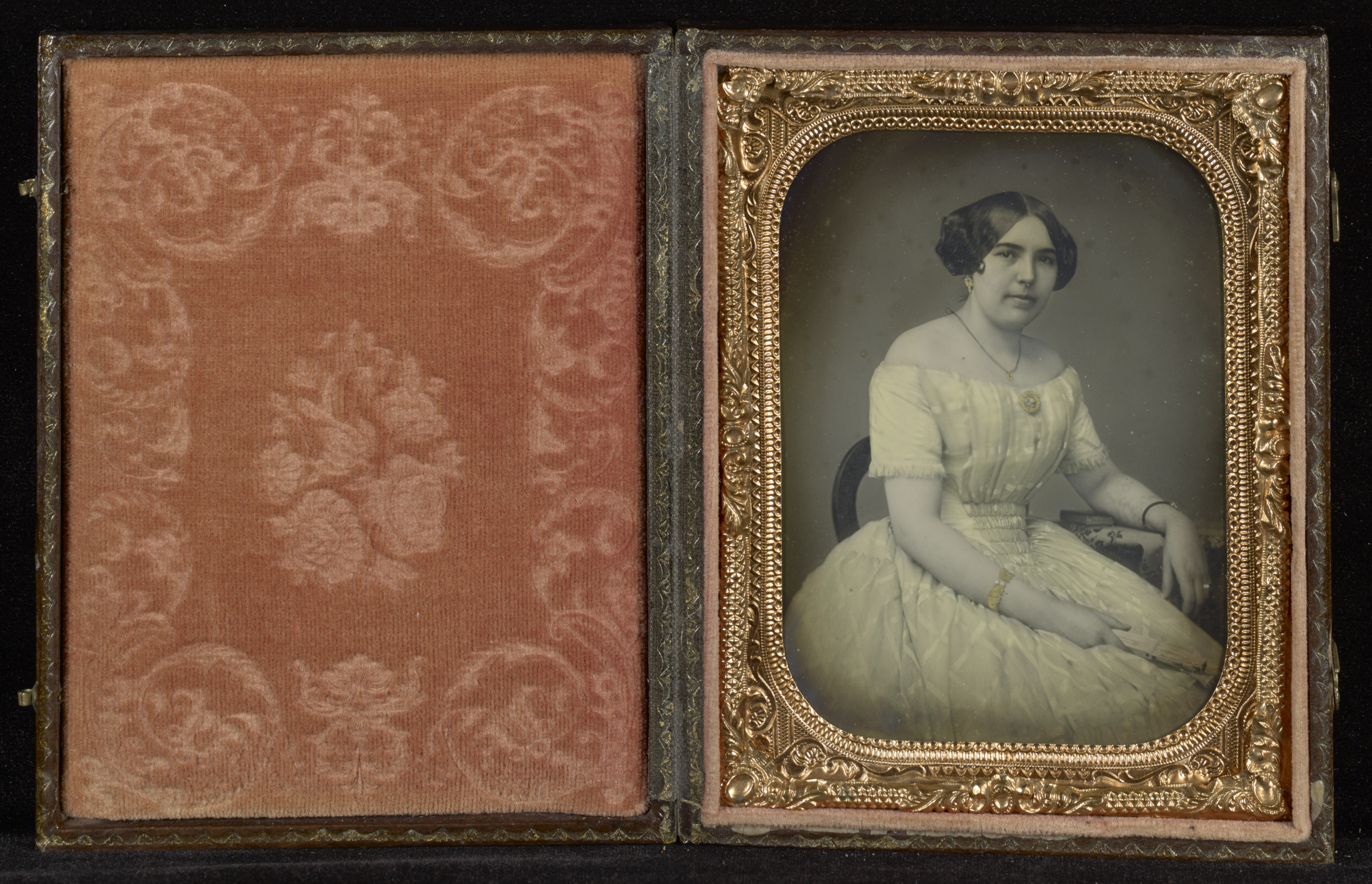 Portrait of a seated woman wearing a shoulder-baring yellow dress. Ornate double elliptical brass mat. Thermoplastic cover with pink velvet lining, metal clasps, and a floral design.