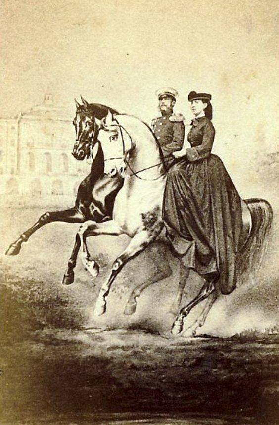 Grand Duke Konstantin Nikolaevich and Grand Duchess Alexandra Iosifovna (Princess Alexandra of Saxe-Altenburg) on horseback