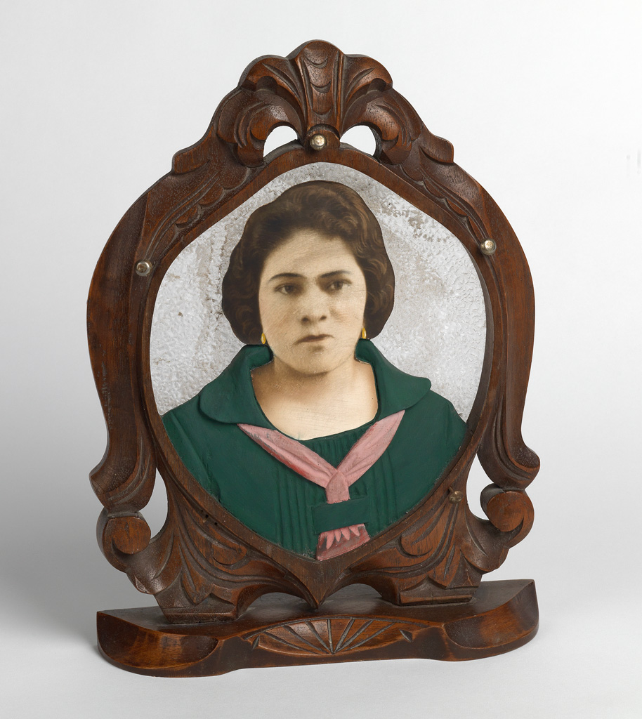 A gracefully hand-colored silver print carefully mounted to a hand-carved wooden armature that seamlessly incorporates the mounted photograph with a dimensional polychromed bust of a verdant blouse with decorative ridges and a carved pink kerchief.