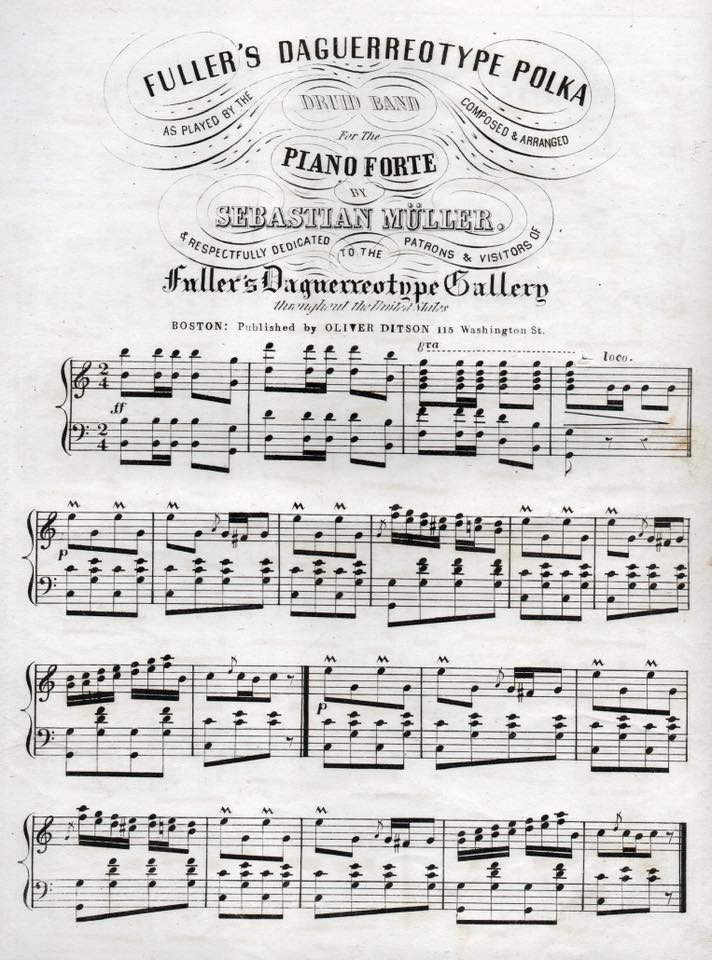Fuller's Daguerreotype Polka" as played by the Druid Band. Composed and arranged for the Piano Forte by Sebastian Muller and respectfully dedicated to the patrons and visitors of Fuller's Daguerreotype Gallery.