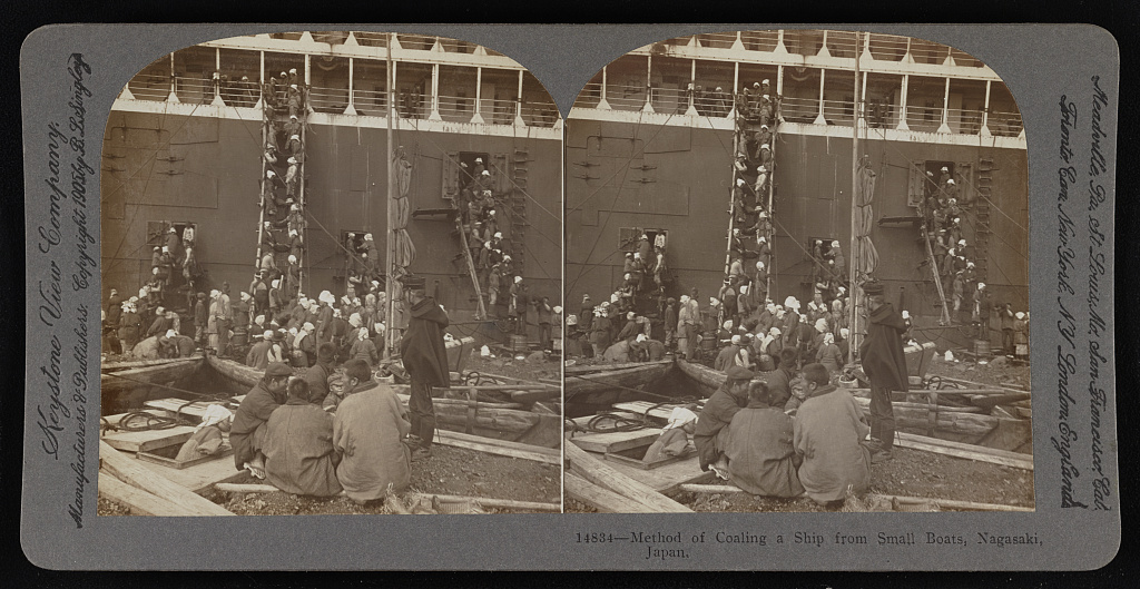 Method of coaling a ship from small boats, Nagasaki, Japan