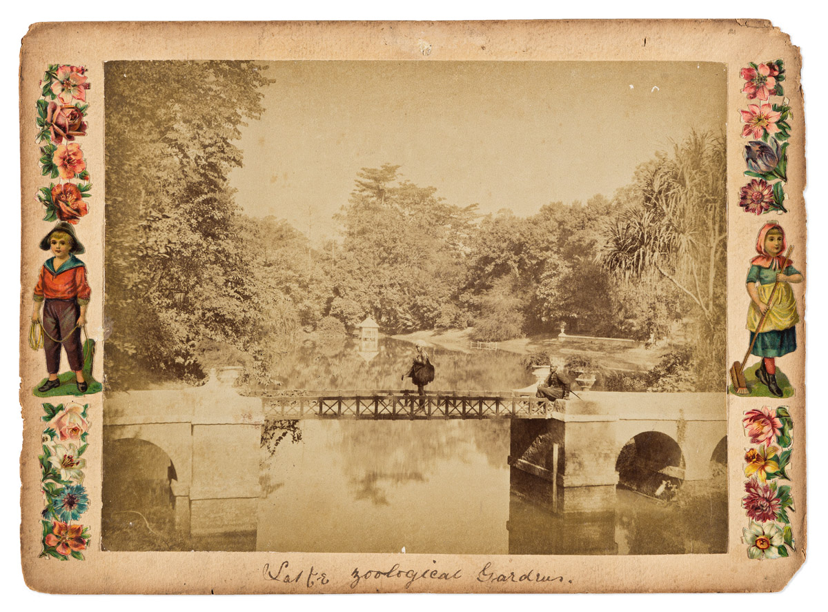 The album depicts major landmarks in each city, including temples, hotels, and colonial government buildings; street and river scenes; and portraits of local figures, including portraits of men and women described as Bhutia. The album features Darjeeling, which was a favorite destination of the colonial British, as well as bustling scenes of bridges and streets, and an Indian juggler. The images are all seemingly hand-selected, the photographs set into a stylized scrapbook. Each are interspersed with meticulously cut and collaged elements, some added embellishments on the mounts surrounding the images, and other full pages of cut elements, including fruit, flowers, bucolic country scenes, and children. Albumen prints, the images measuring 8x6 to 9 1/4x11 1/2 inches (20.3x15.2 to 23.5x29.2 cm.), and the reverse, mounted recto/verso, most with captions, in ink, below the images.