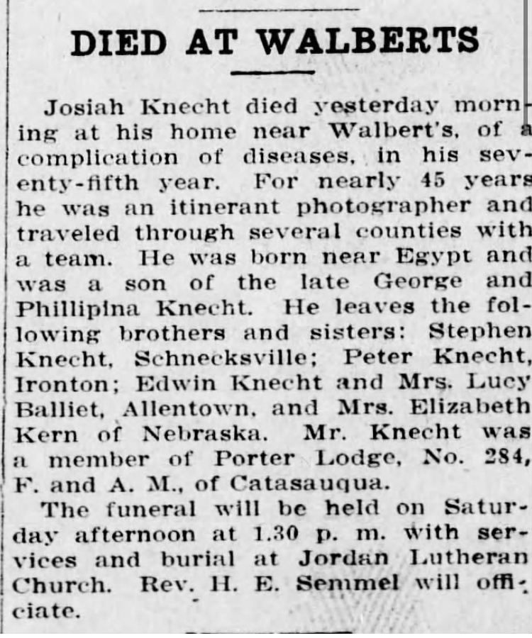 "Died at Walberts" (Obituary for Josiah Knecht)