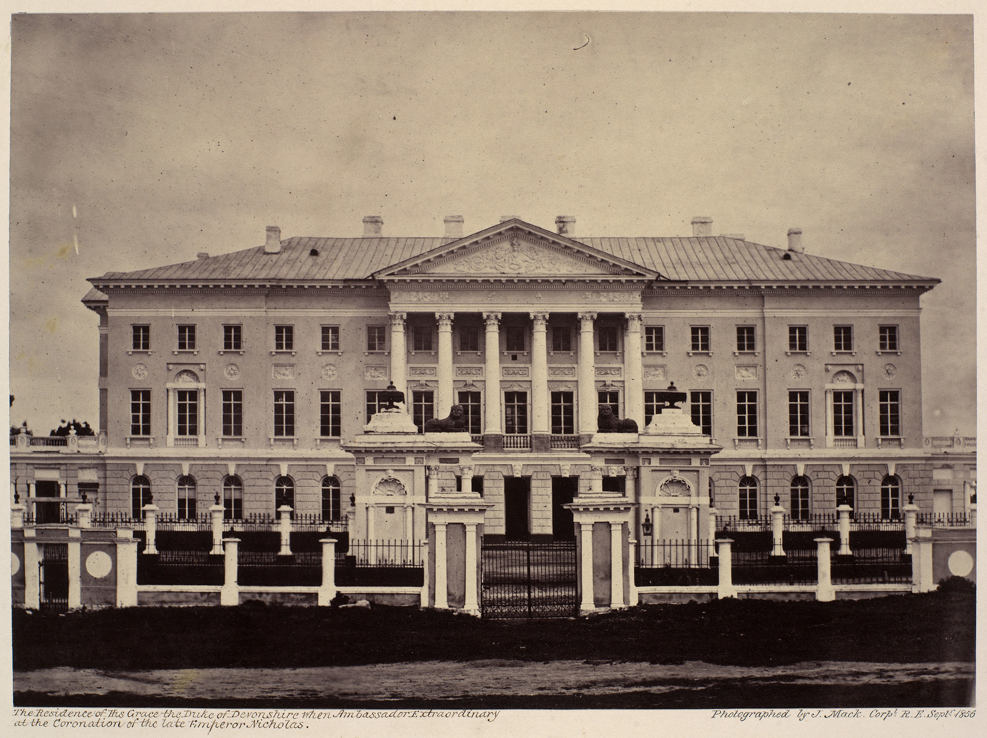 Photograph of the residence used by the 6th Duke of Devonshire when Ambassador Extraordinary at the coronation of Nicholas I, Emperor of Russia in 1826. The building is in the classical style with three storeys and a central portico with six corinthian columns and a pediment. It is surrounded by a fence and there are two statues of lions on pillars either side of the gate. The 6th Duke of Devonshire attended the coronation of Nicholas I, Emperor of Russia as the British Representative. In 1856 his nephew Lord Granville led the British delegation at the coronation of Alexander II, Emperor of Russia. This is one of a series of photographs taken by Corporal J Mack during the coronation celebrations of 1856.