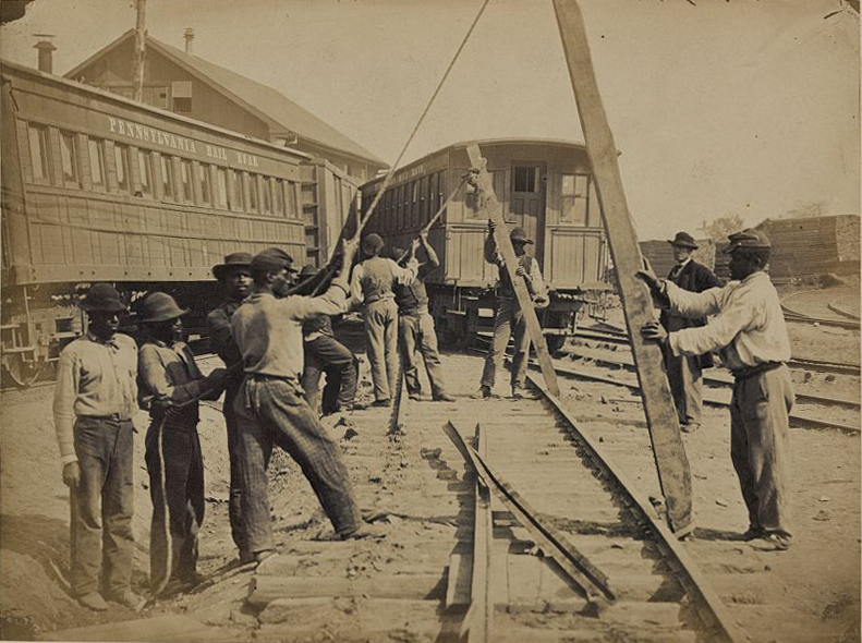 A.J. Russell 1863 (published) [Military railroad operations in northern Virginia: men using levers for loosening rails] [Photographs illustrative of operations in construction and transportation, as used to facilitate the movements of the Armies of the Rappahannock, of Virginia, and of the Potomac ...]