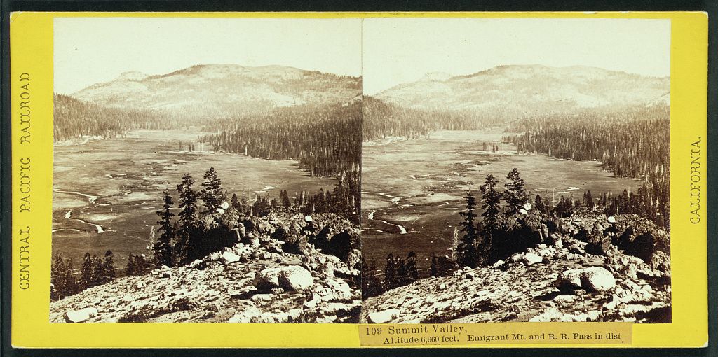 Alfred Hart 1865-1869 Summit Valley, altitude 6,960 feet. Emigrant Mt. and R.R. pass in the distance [Central Pacific Railroad, California. Scenes in the Sierra Nevada Mountains. No. 000]
