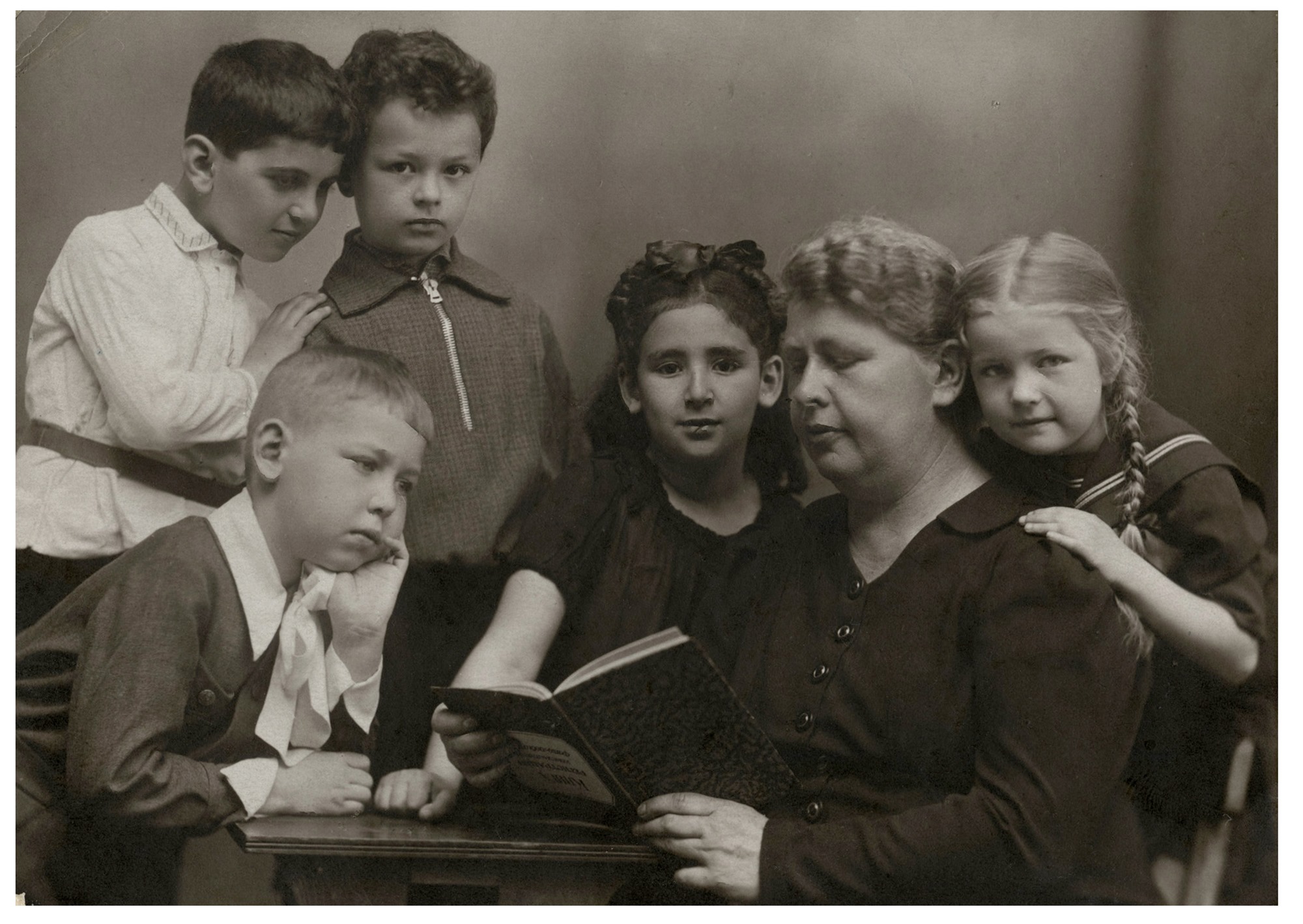 The children listen with interest to the teacher reading the book. In the hands of the teacher turned upside down "Book for registration of visitors of the photo studio".