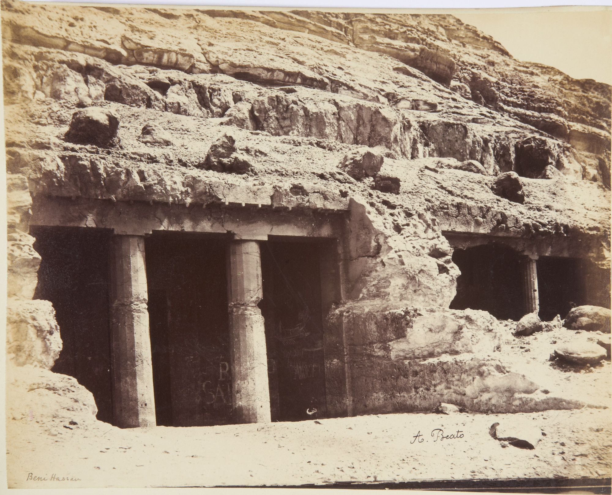 Photograph of entrance to tomb: rectangular portal with two columns; graffiti visible on inside wall; to right is another entrance, single column visible; rocks slope away above