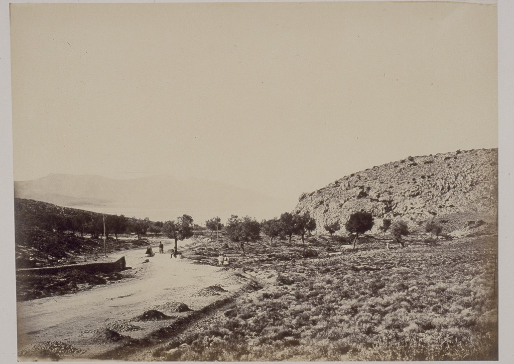 Title written on mount. This photograph depicts a group of tourists walking along the 19th c. road that follows the path of the Sacred Way from Athens to Eleusis. The rock outcrop in the right middle ground is near the Temple of Aphrodite, which had yet to be discovered at the time the photograph was taken (it was excavated during 1891-1892). The island of Salamis, with its distinctive twin peaks known as the Horns of Salamis, is visible in the background.