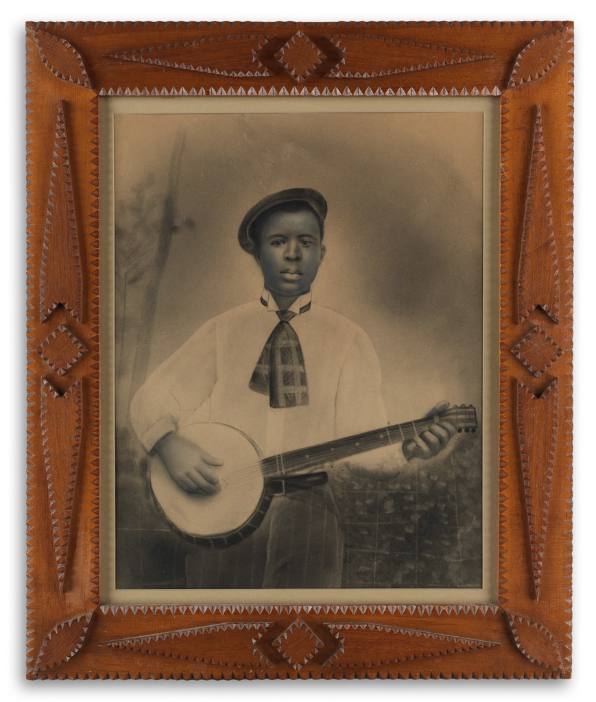 Unidentified photographer 1900 (ca) Portrait of a young banjo player, in a period Tramp Art frame