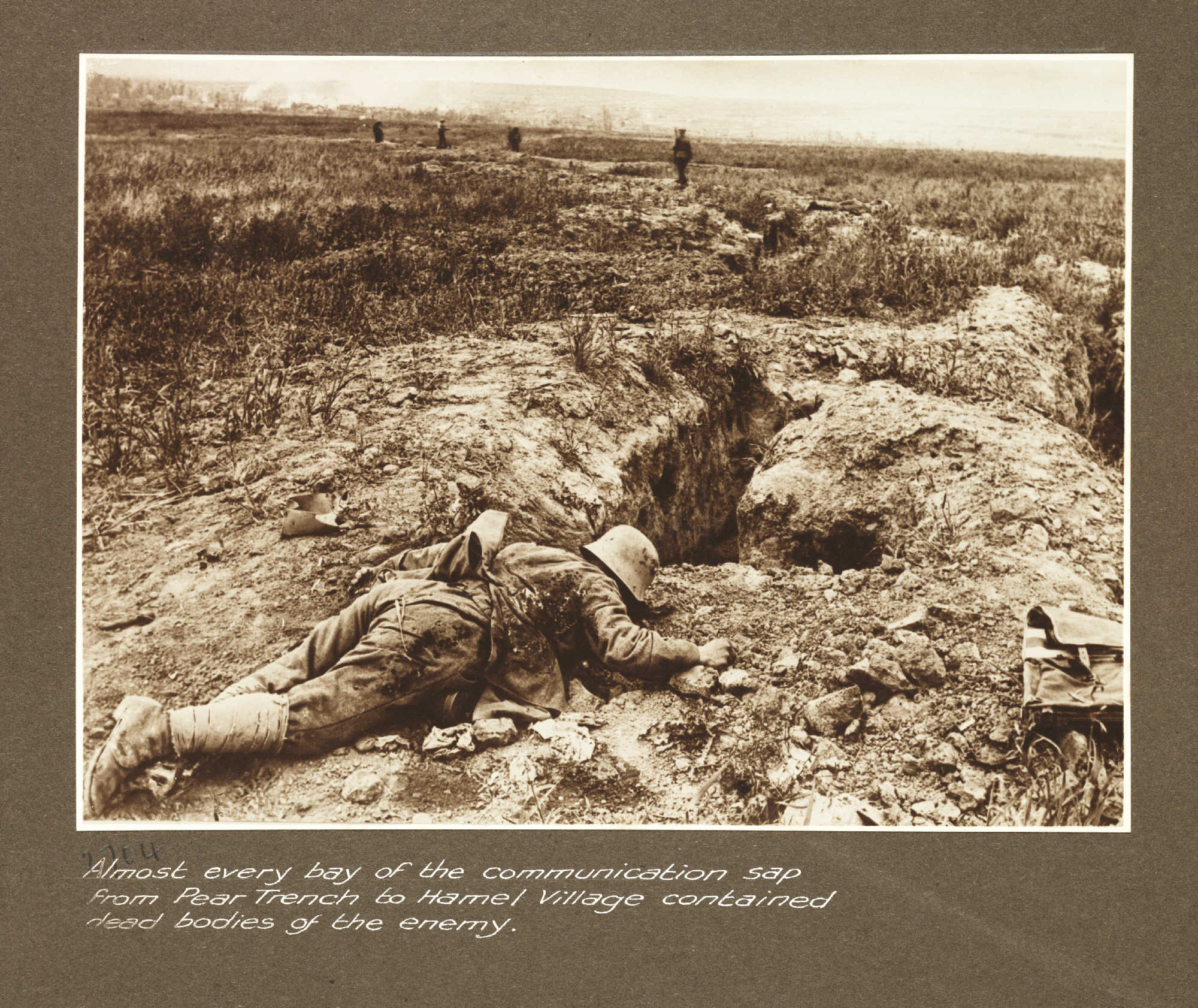 Almost every bay of the communication sap from Pear trench to Hamel Village contained dead bodies of the enemy