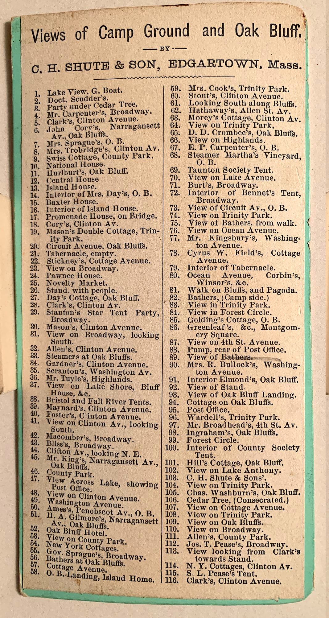 Backlist for "Views of Camp Ground and Oak Bluff. - C.H. Shute & Son, Edgartown."