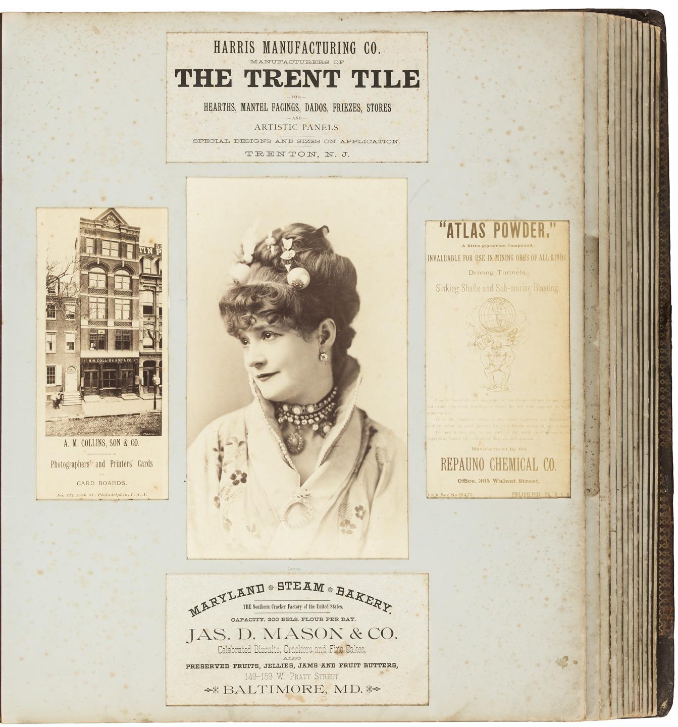 This monumental volume was created by the prominent New York photographer, Napoleon Sarony. Each side of the 23 thick board pages contains a matted albumen photograph and four matted advertising cards. Of the photographs, 42 are large portraits of notable actresses. Portraits of Grover Cleveland and his Vice President, a portrait of the celebrated coronet player Liberati, and a photograph of the Owen paper-making establishment (possibly the producer of this album) are also included. Of the 184 advertisements, 91 are photographs, the others are either engraved, lithographed, or chromolithographed. The large photographs measure 11½ x 6¾ inches (292 x 171 mm.), while the advertisements are mostly 8 x 4 inches (203 x 102 mm.) or the reverse. Produced to sit in the lobby or bar of pre-eminent hotels, art albums were a kind of concierge service, created to entertain and inform visitors of the businesses and pleasures associated with these exclusive establishments. This album is filled with seductive portraits of the stars of the Belle Epoque, including Fannie Davenport, Adelina Patti, Lilly Langtry, Ada Rehan, Lotta Crabtree, Modjeska, Ellen Terry, and Lillian Russell, plus dozens of advertisements for goods and services. All were posed and photographed by the greatest photographer of the American theater, Napoleon Sarony (1821-1896). He established a studio on Broadway in New York in 1866 and for the next thirty years Sarony photographed virtually every actor and actress working on the New York Stage. The Hoffman House was located on Broadway between 24th Street and 25th Street. Built in 1864, it quickly became the informal meeting place for the Democratic Party in New York. Grover Cleveland stopped there frequently, and was living there when he was elected to the Presidency for his second term. General Benjamin Butler and General Winfield Scott made the hotel their home on several occasions, and William Randolph Hearst lived at the Hoffman when he first came to New York City. Edward S. Stokes, who shot financier James Fisk, Jr., became a partner in the hotel, serving as general manager until 1897. The elegant barroom with its shocking painting Nymphs and Satyrs by Bougereau, became a major tourist attraction. Due to their large size and small number, hotel art albums" rarely survived. We have located two others in public institutions. One for the Parker House of Boston is at Brown University, and the other for the Ponce De Leon Hotel of Saint Augustine, Florida is at Jacksonville University.
