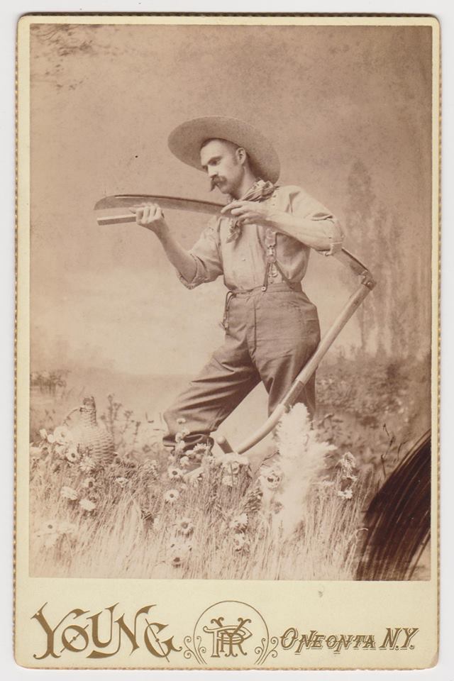 Studio portrait of a man sharpening a scythe