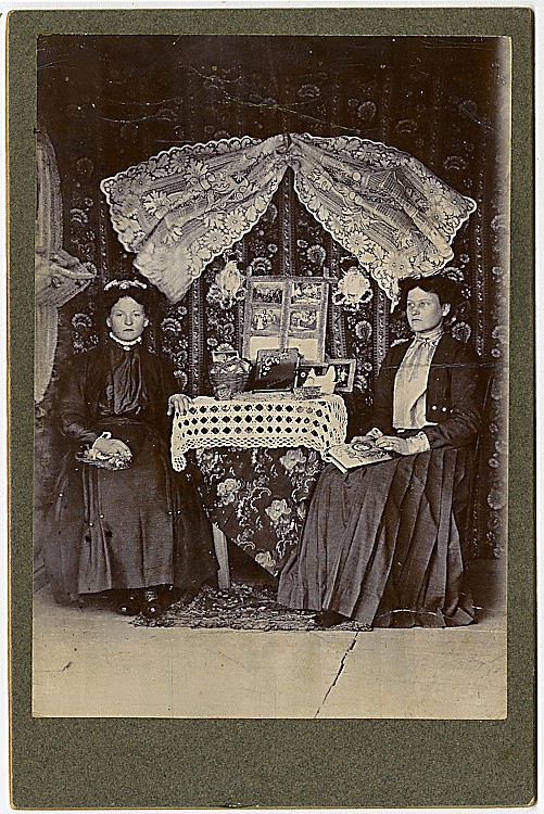 A booth offering cabinet cards and albums. There's an upright display of photographs.in back, an album and a basket of photographs on the table. The woman at the right has an album on her lap. The entire area of the image is full of details, with flowers on the wallpaper, the table cloth, the lacy covering above.