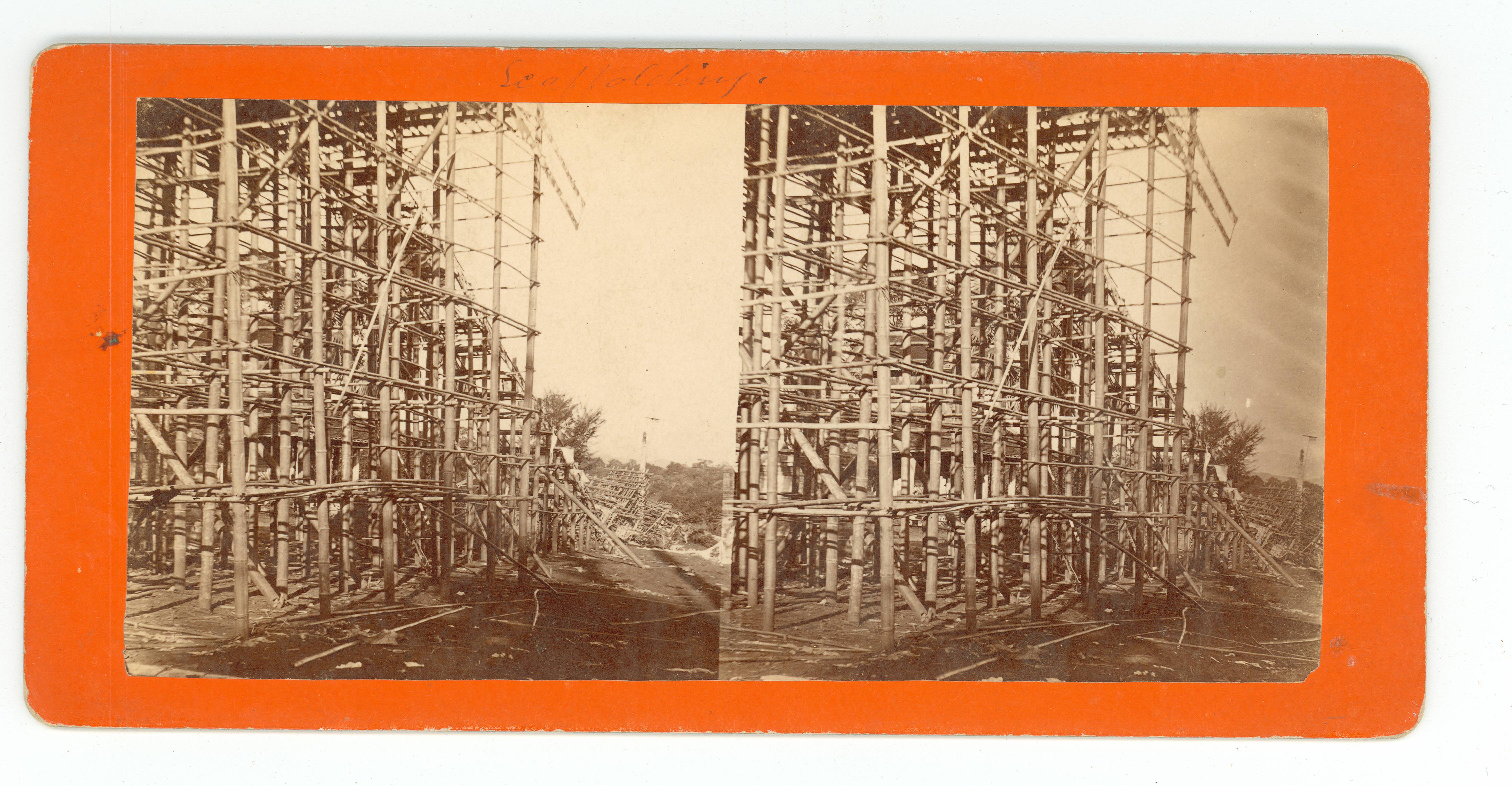 Bamboo scaffolding with steps inclining up the right side