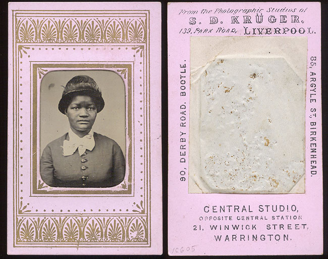 Tintype, carte de visite mount Christopher Wahren Fine Photographs CDV-mount imprinted on reverse "From the Photographic Studios of S. D. Kruger 139 Park Road, Liverpool. / 90 Derby Road, Bootle / 85, Argyle St. Birkenhead. / Central Studio opposite Central Station / 21 Winwick Street, Warrington."