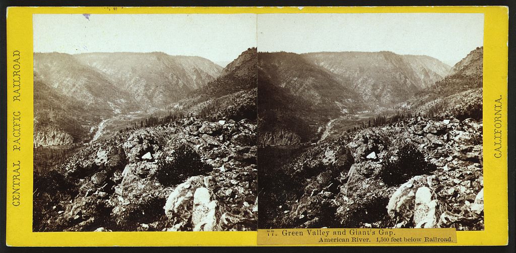 Alfred Hart 1865-1869 Green Valley and Giant's Gap. American River, 1,500 feet below railroad [Central Pacific Railroad, California. Scenes in the Sierra Nevada Mountains. No. 000]