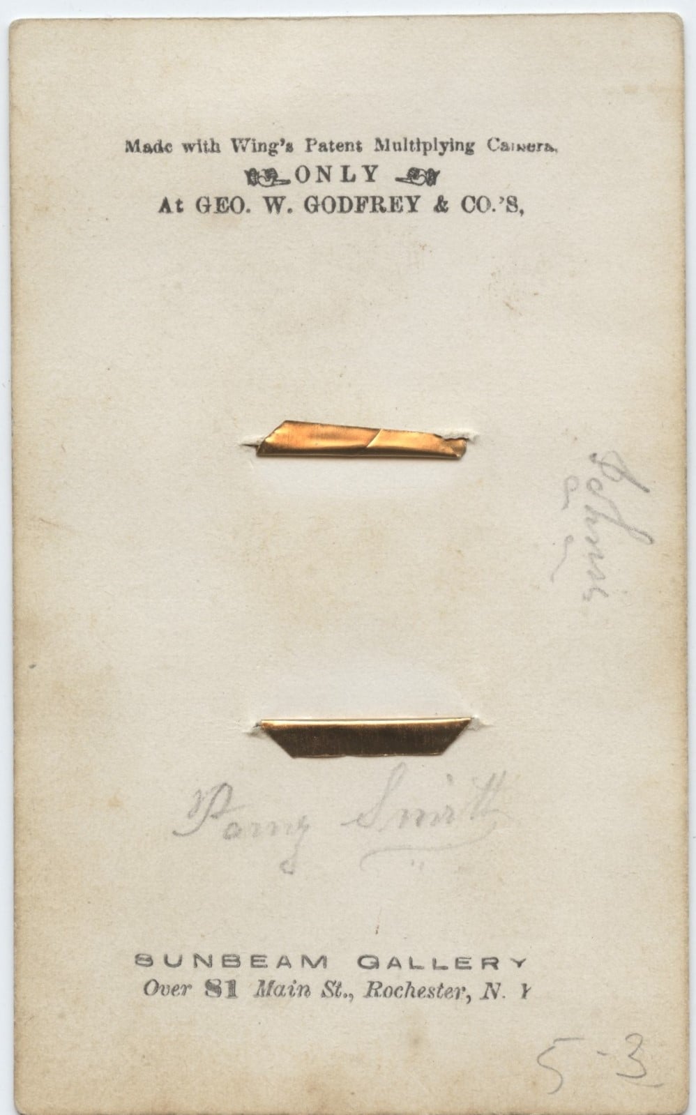 Back of a little gem on a carte de visite - "Sunbeam Gallery, Over 81 Main St., Rochester, N. Y."