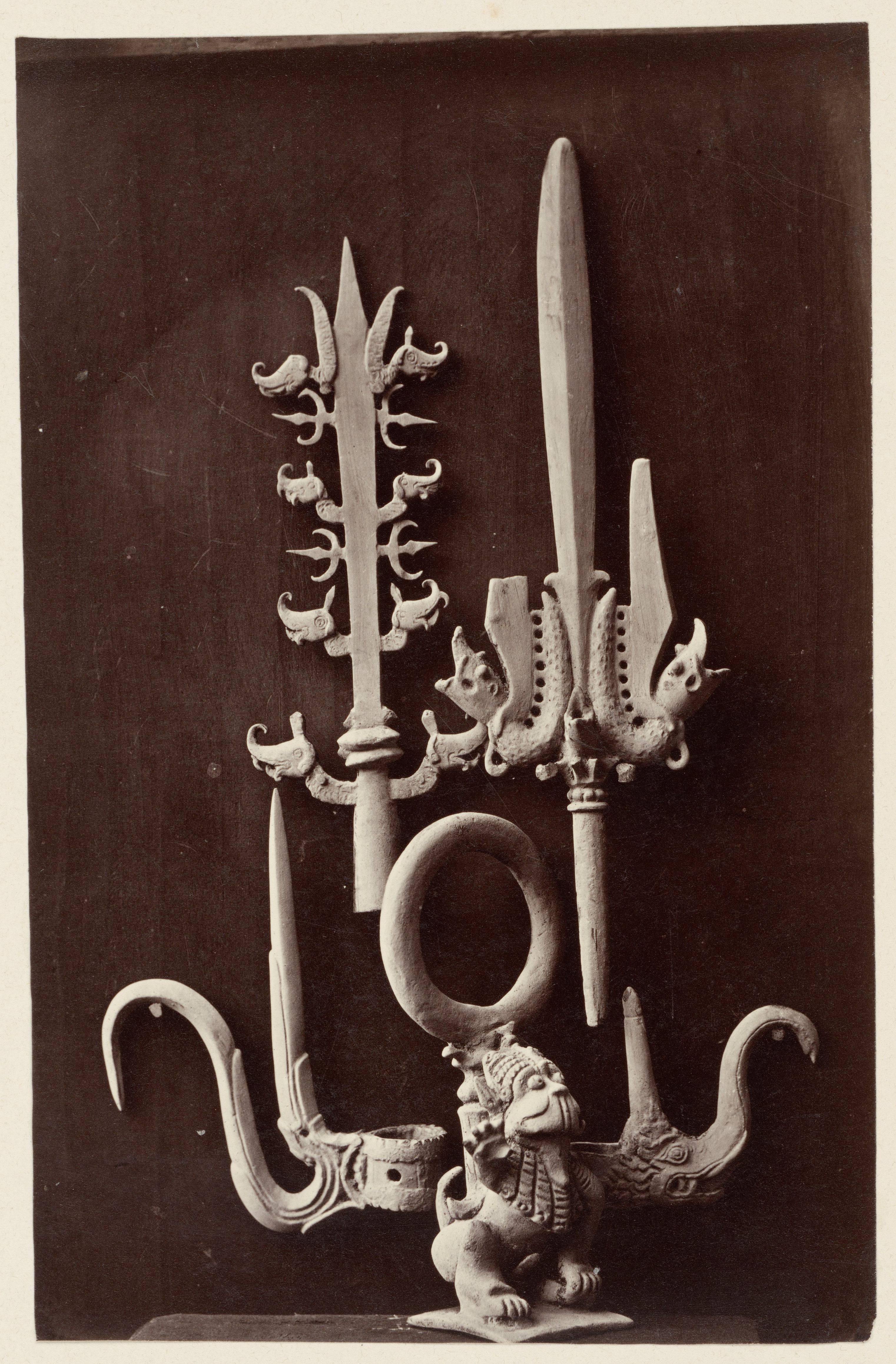 Ritual implements including a finial of a processional staff and part of a lion-shaped lamp, Talaga, Cirebon district, West Java province, 16th-18th century, Indonesia