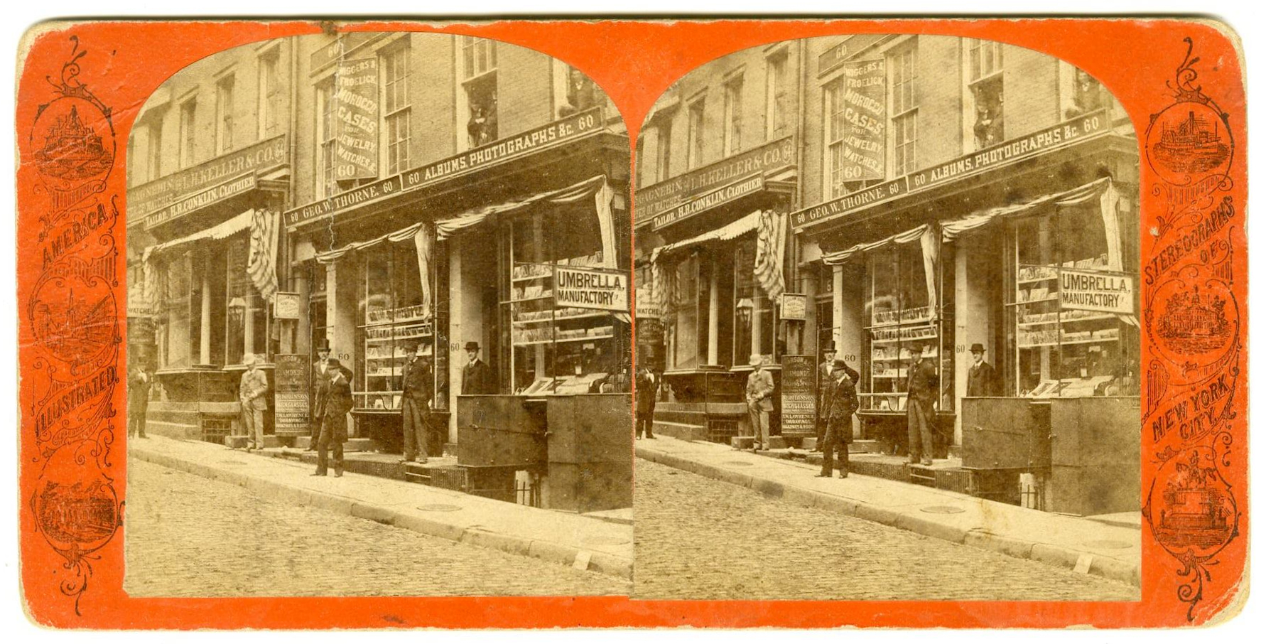 Stereoview The Jeffrey Kraus Collection (Jeffrey Kraus, 22 November 2020) This is actually 60 Nassau Street near John Street, not Broadway. Geo. W. Thorne's store selling Photographs, albums, etc.