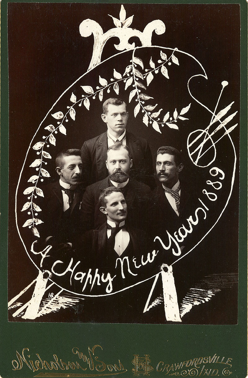 "Happy New Year 1889" - portrait of five men within a palette and easel motif