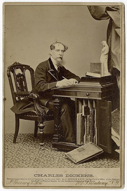 Copyright 1867 by J. Gurney. The backmark refers to this as a "Carte Imperiale" indicating that the term "Cabinet Card" had still not become common. This was Dickens' second reading tour in the US. A desk has been set up in Gurney's studio.