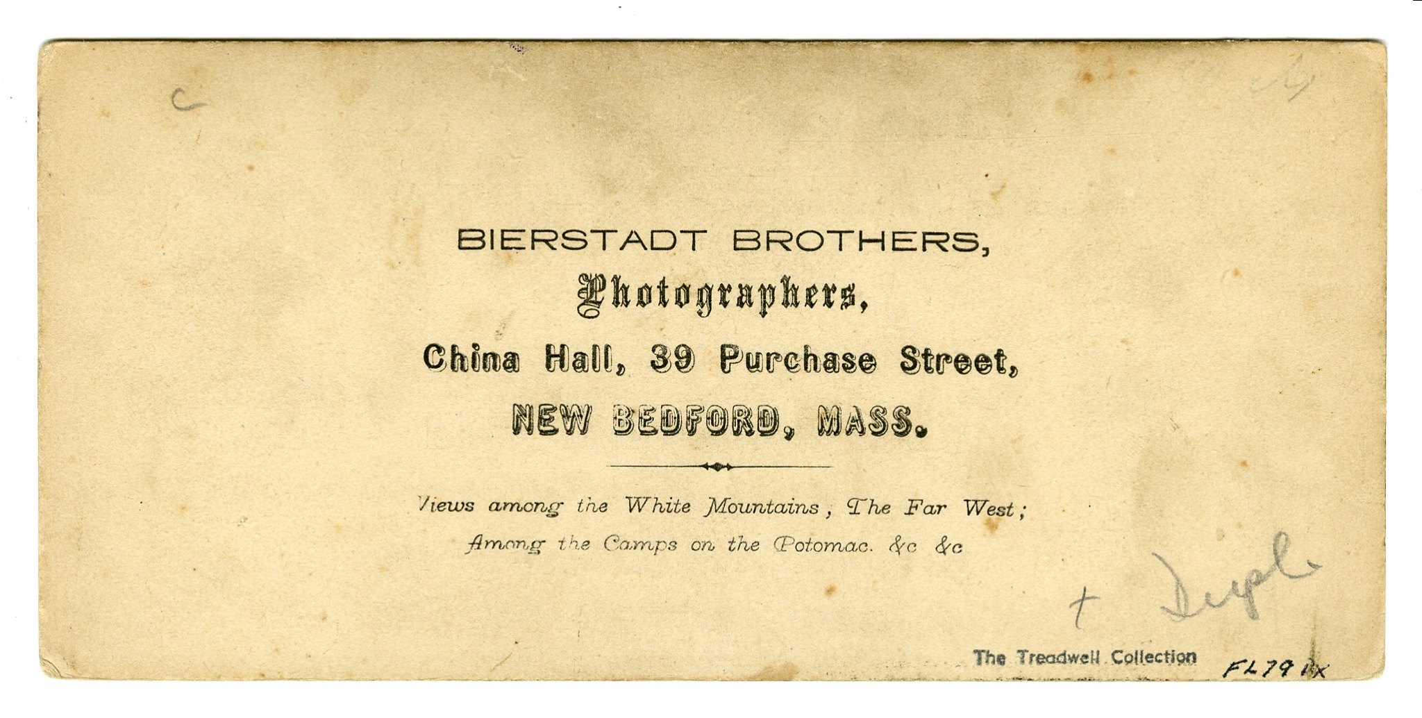 Backmark for "Bierstadt Brothers, Photographers, China Hall, 39 Purchase Street, New Bedford, Mass."