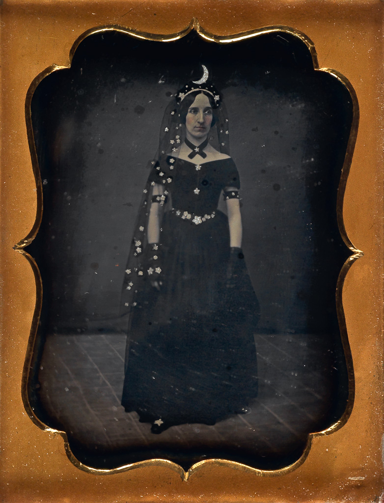 A woman in a fanciful costume, her headdress adorned with a crescent moon, and her dress and shawl with tiny, hand-painted silver stars
