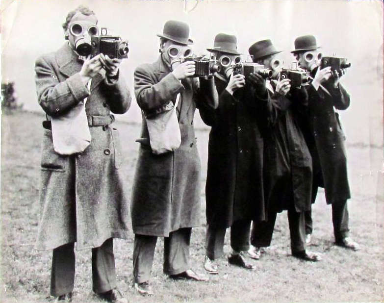 Five photographers wearing gas masks