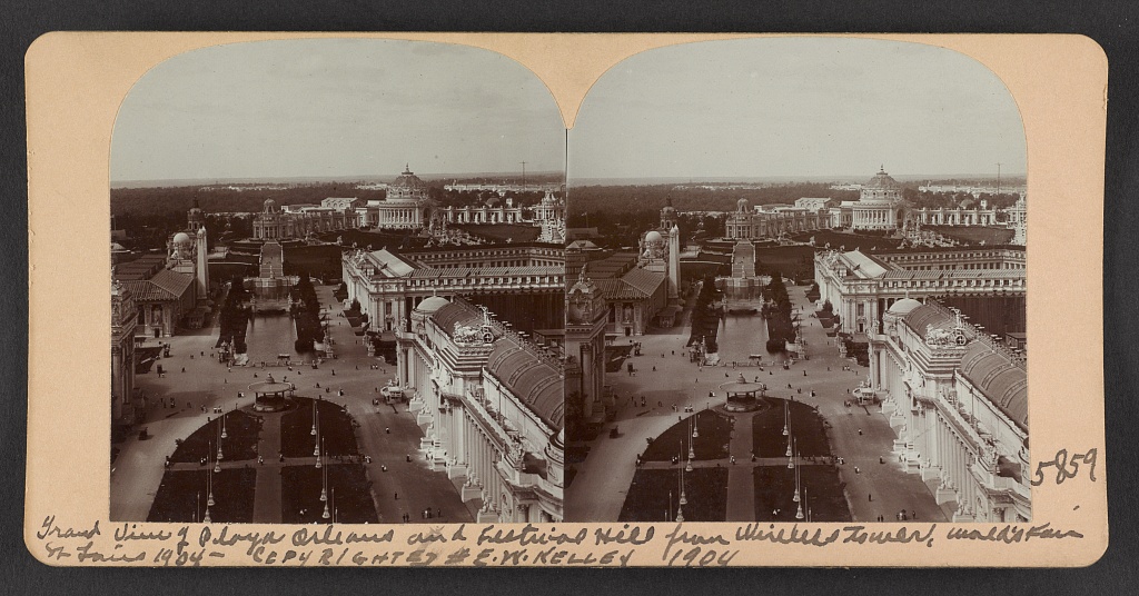 Grand view of Plaza Orleans and Festival Hill from wireless tower, World's Fair, St. Louis, 1904.