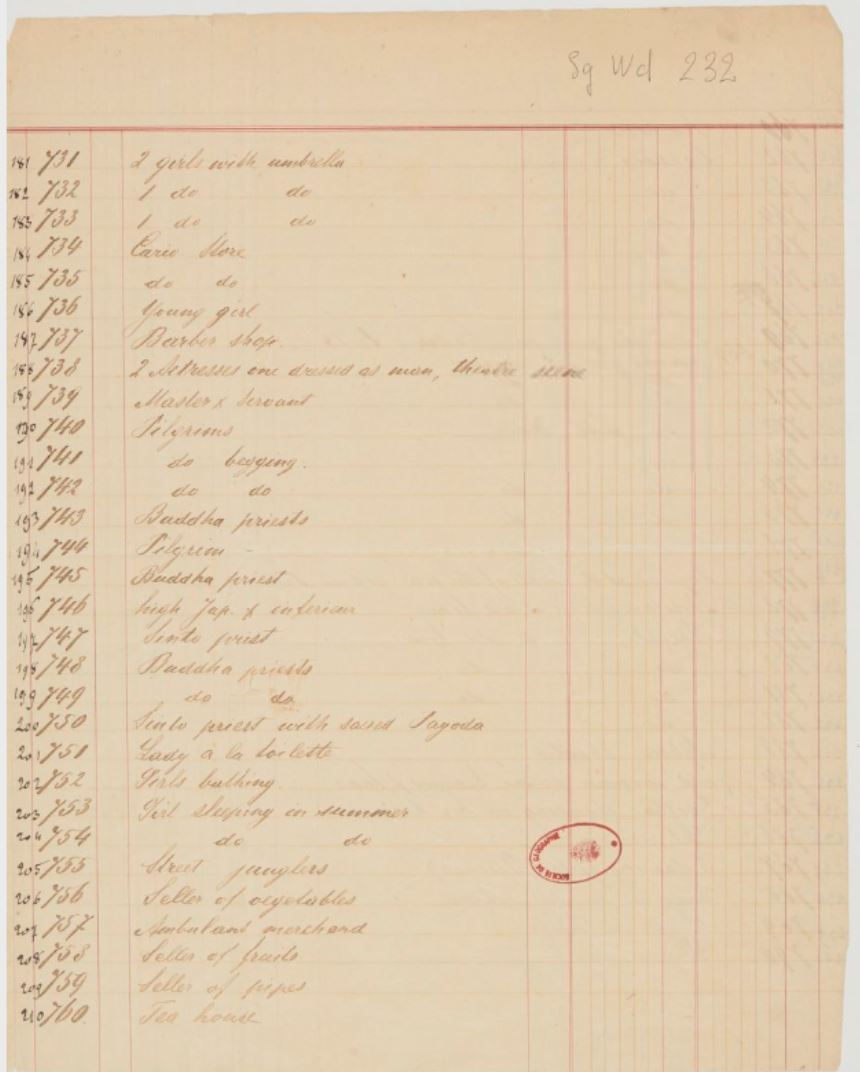 (Note added by Alan Griffiths, 25 June 2019) The date of the ledger has been questioned. Luke Gartlan, a specialist on early photography in Japan, wrote "Stillfried left Japan for good in 1881, but his name persisted in studio names in Yokohama for several years. These albums are a compilation when various studios merged. So I think 1884 is probable for the list." (Facebook, Alan Griffiths page, 25 June 2019)