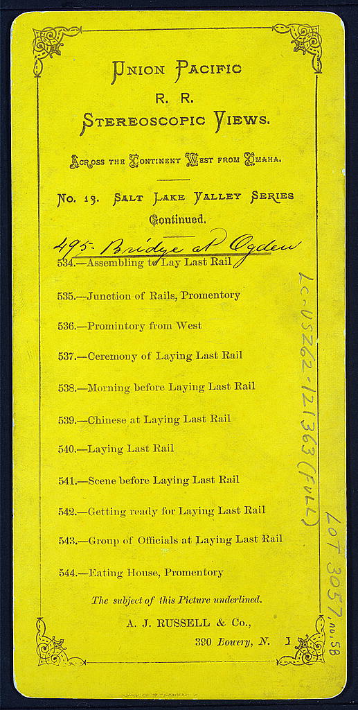 Backlist for "Union Pacific R.R. Stereoscopic Views. Across the Continent West from Omaha." - "No. 13. Salt Lake Valley Series Continued."