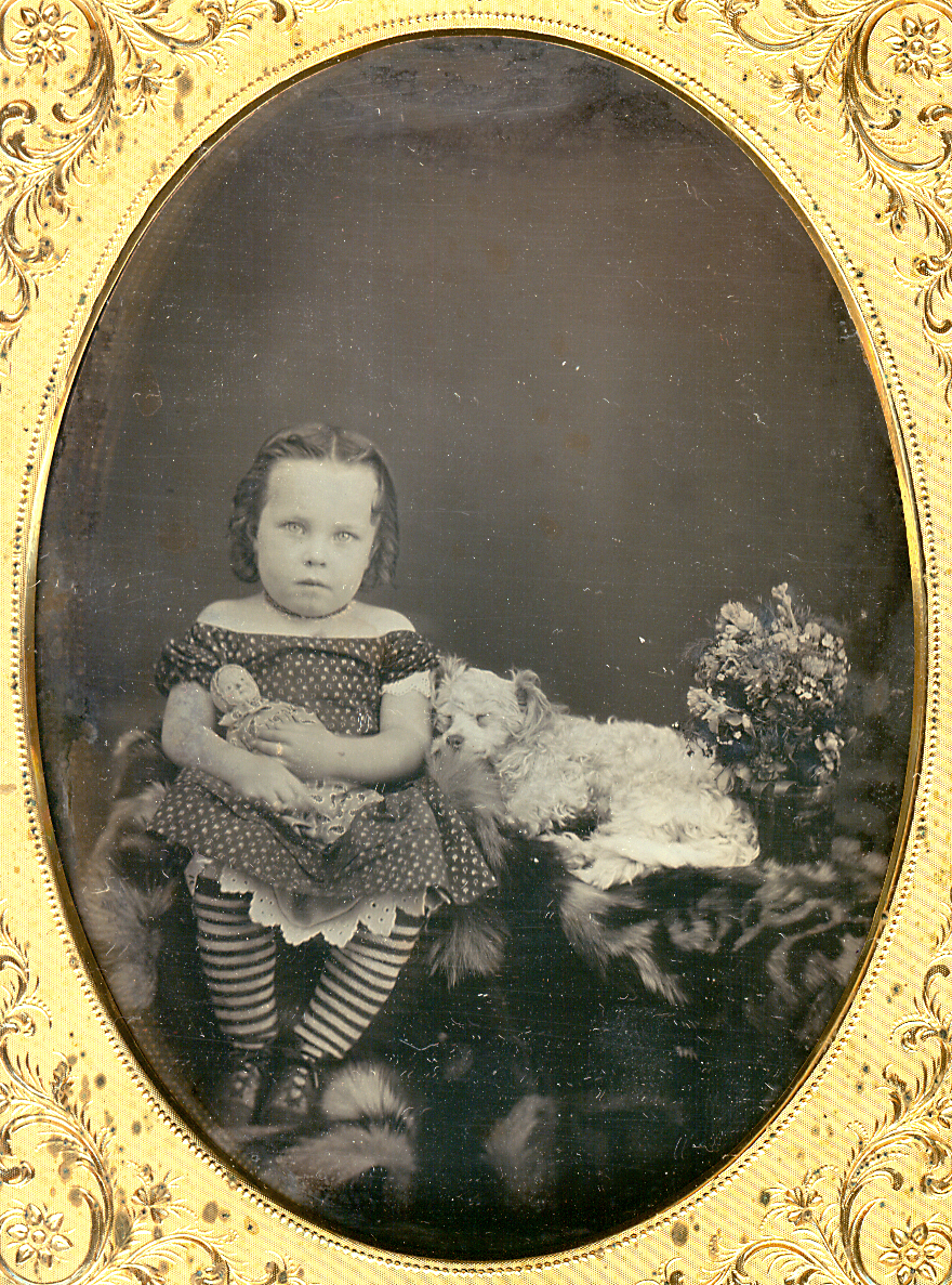 A scene of intimate comfort. The girl holds her doll with both arms; the dog snuggles against her. This is a + plate daguerreotype in an ornate oval mat, in a velvet-covered case with hinged latch, iridescent white satin pad, separated cover.