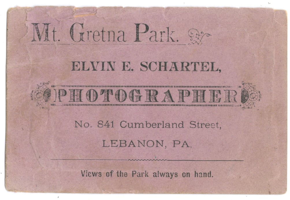 Backmark for "Mt. Gretna Park. - Elvin E. Schartel, Photographer. No. 841 Cumberland Street, Lebanon, PA. - Views of the Park always on hand."