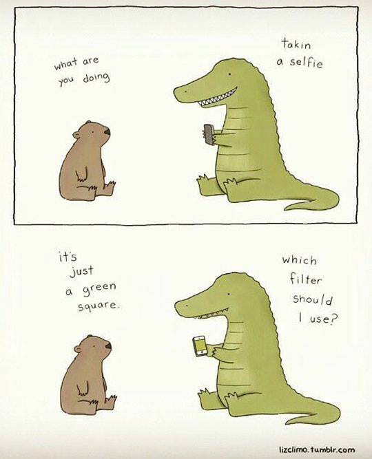 what are you doing - takin a selfie - it's just a green square - which filter should I use?