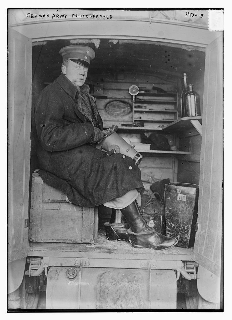 Photograph shows a German army photographer seated in a vehicle during World War I.