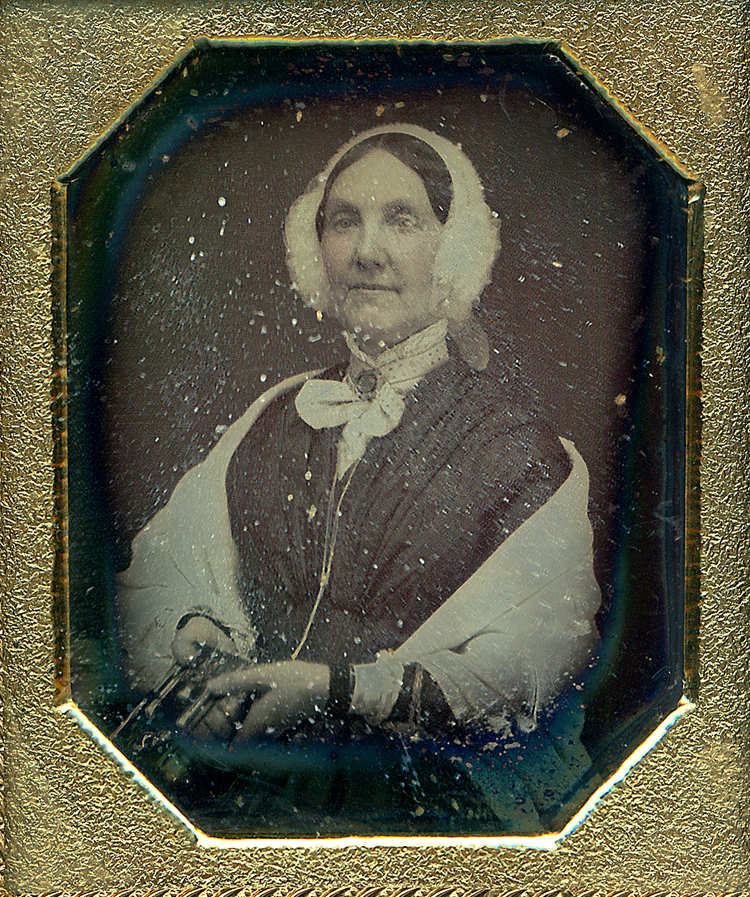 The unusual case opens to reveal a 1/2 plate ambrotype of three sisters in the center. In the left panel there are two 1/6 plate daguerreotypes. One is a lovely image of a mother holding a tiny baby. (There is dust on the underside of the glass.) Below that is a 1/6 plate daguerreotype of a woman, by Anson. Possibly she is the mother of the first image. The right panel has, on top, a superb 1/6 plate by Anson, a close portrait of a girl in ringlets, with bows on her dress tinted red. Beneath is another 1/6 plate in a stippled octagonal mat, of a woman in a bonnet holding a case. This again could be the mother.