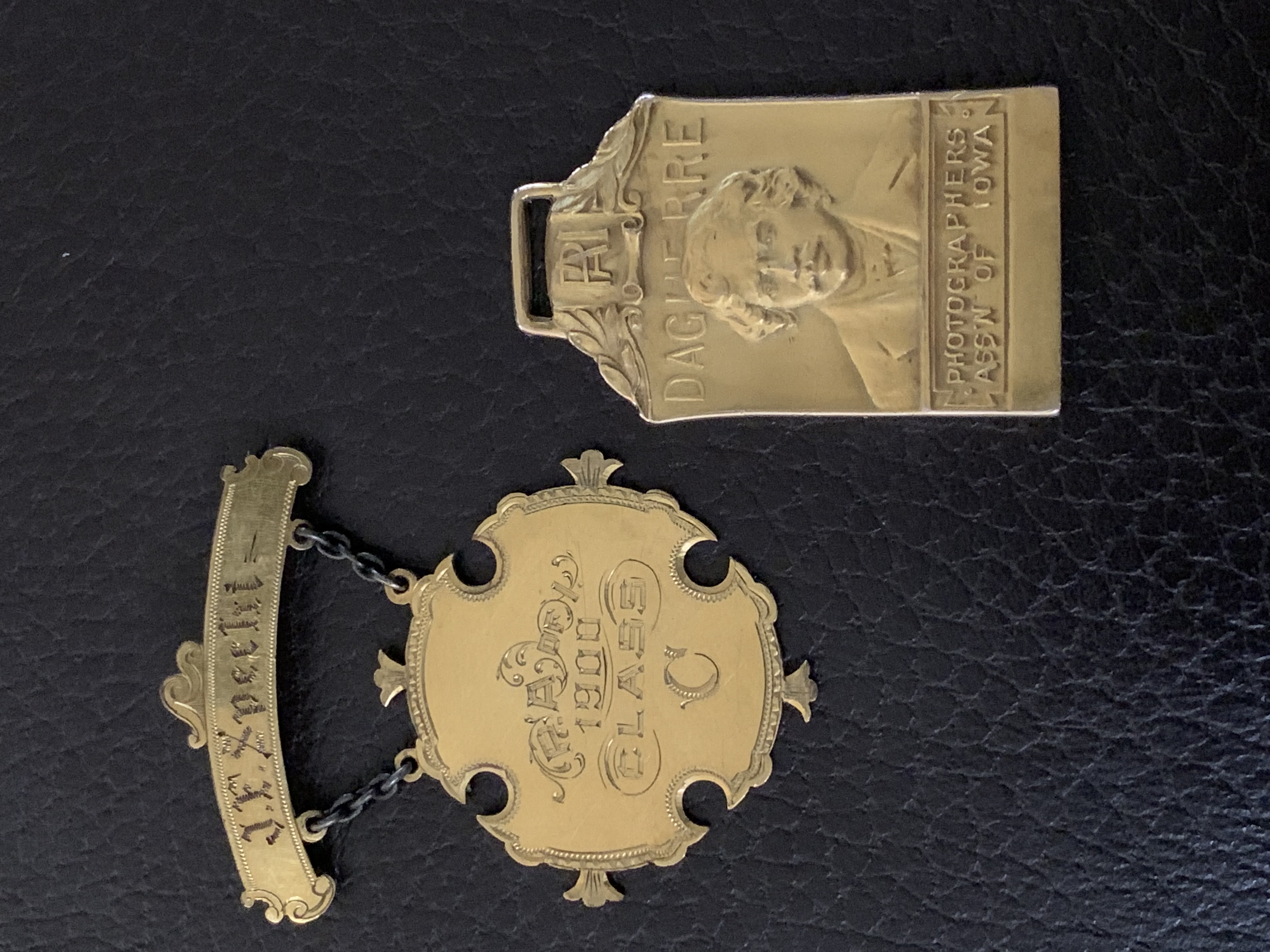 Medal awarded by the "Photographers Ass'n of Iowa" to Jacob F. Specht and a watch fob for the "Photographers Ass'n of Iowa"