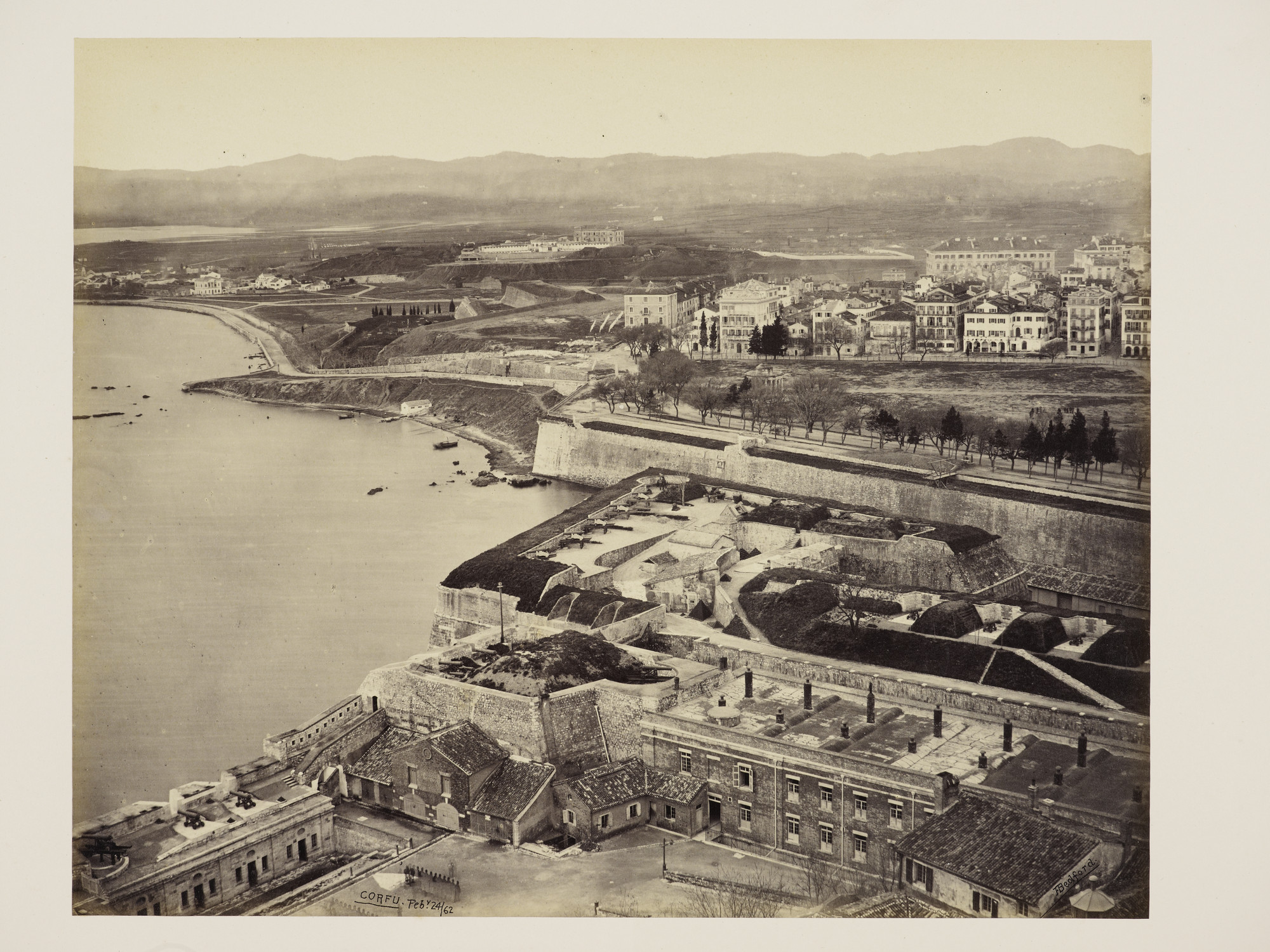 Corfu Citadel: Elevated view from the Citadel down onto harbour, left, and town right. This image, with the preceding image in the sequence (RCIN 2700854) makes a two-part panoramic view from the citadel towards the old town. The photograph is signed, captioned and dated in the negative, 'F Bedford Corfu'. The number in the Day & Son series is 131.