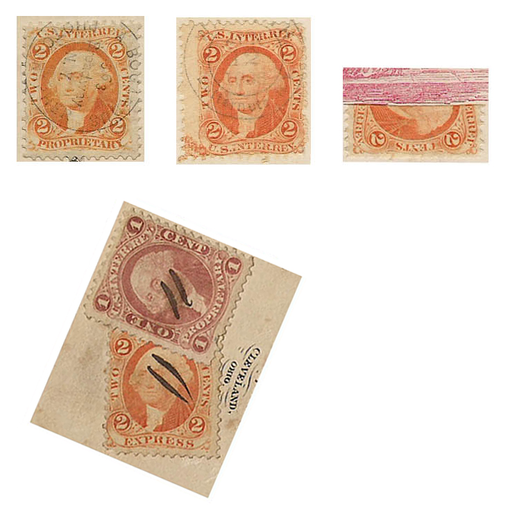Tax revenue stamps on carte de visite, orange, 2 cent "Proprietary", 2 cent "U.S.Inter.Rev.", 2 cent "Express" and 2 cent "U..S. Inter. Rev." half