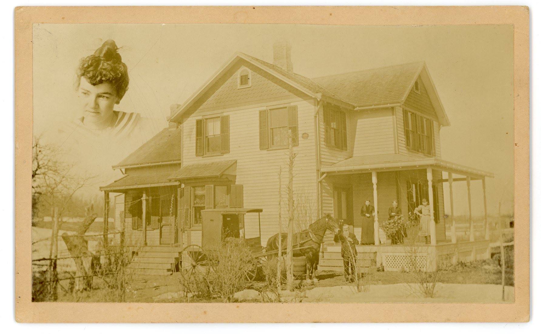 Combination photograph with a woman and a rural house with yard