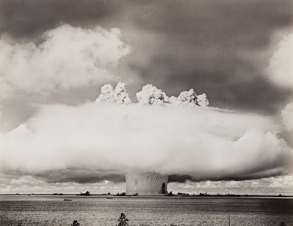 In January 1946, a U.S. nuclear weapon mission dubbed Operation Crossroads began testing atomic bombs on the remote lagoon of Bikini Atoll. Automatic cameras were mounted in towers on the lagoon and Crossroad pilots flew photo specific planes at a safe distance to capture the detonation stages of two atomic explosions, the Baker Day and Able Day blasts. The photographs in this collection showcase aerial views and stationary ground level shots of both blasts at various stages. Silver prints, the images measuring approximately 7x9 inches (17.8x22.9 cm.), the sheets 8x10 inches (20.3x25.4 cm.), and the reverse, most with a numeric hand stamp, on verso, and most accompanied by a typewritten caption. 1946