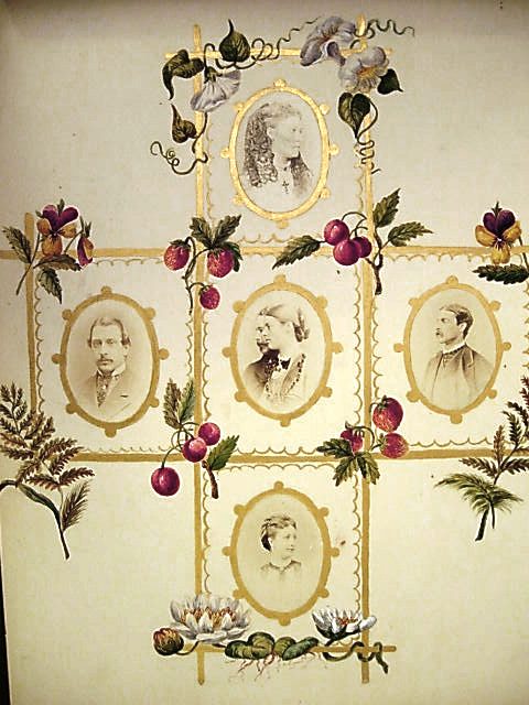 Collage album consisting of albumen photographs arranged and adhered to twenty-nine hand-coloured pages by Queen Alexandra (1844-1925), when Princess Alexandra of Wales. This is one of two similar albums on which the Princess worked in the 1860s, which display her skill as a watercolour painter and designer. The other, which was unfinished, is now in the collection at Frederiksborg Castle, Denmark. The floral design includes photographs of the Princess's four eldest children.