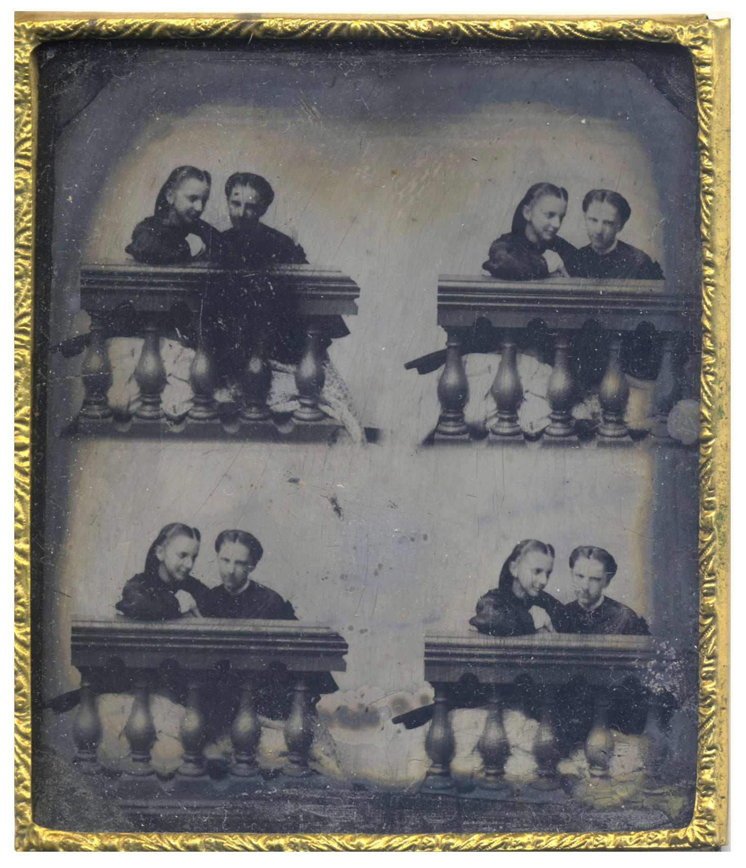 Uncut tintype plate showing four versions of a woman and a man behind a studio prop balustrade