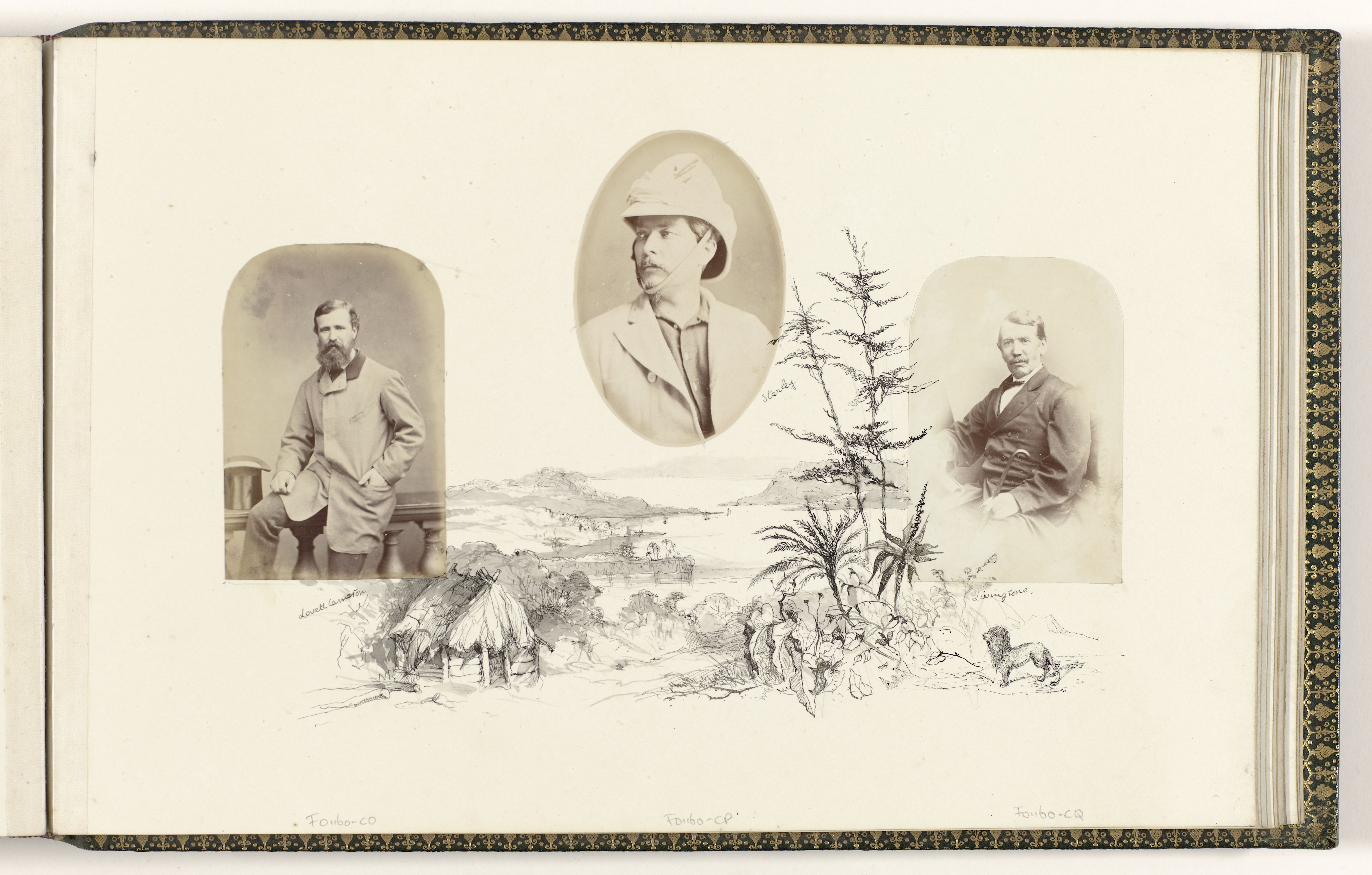 Portrait of Stanley with helmet bordered by drawing Africa landscape with hut, bay and lion